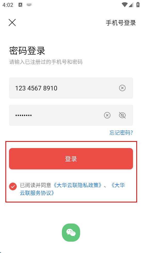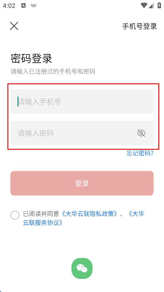 3、在密碼登錄界面,輸入手機(jī)號碼和密碼,勾選已閱讀并同意大華云聯(lián)隱私政策和大華云聯(lián)服務(wù)協(xié)議。