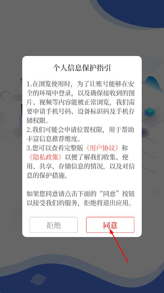 1、打開鞏義APP,出現(xiàn)個人信息保護指引頁面,仔細查看后點擊“同意”按鈕。