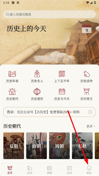 1、打開中華歷史app,點(diǎn)擊底部導(dǎo)航欄中的我的選項(xiàng),進(jìn)入個(gè)人相關(guān)頁(yè)面。