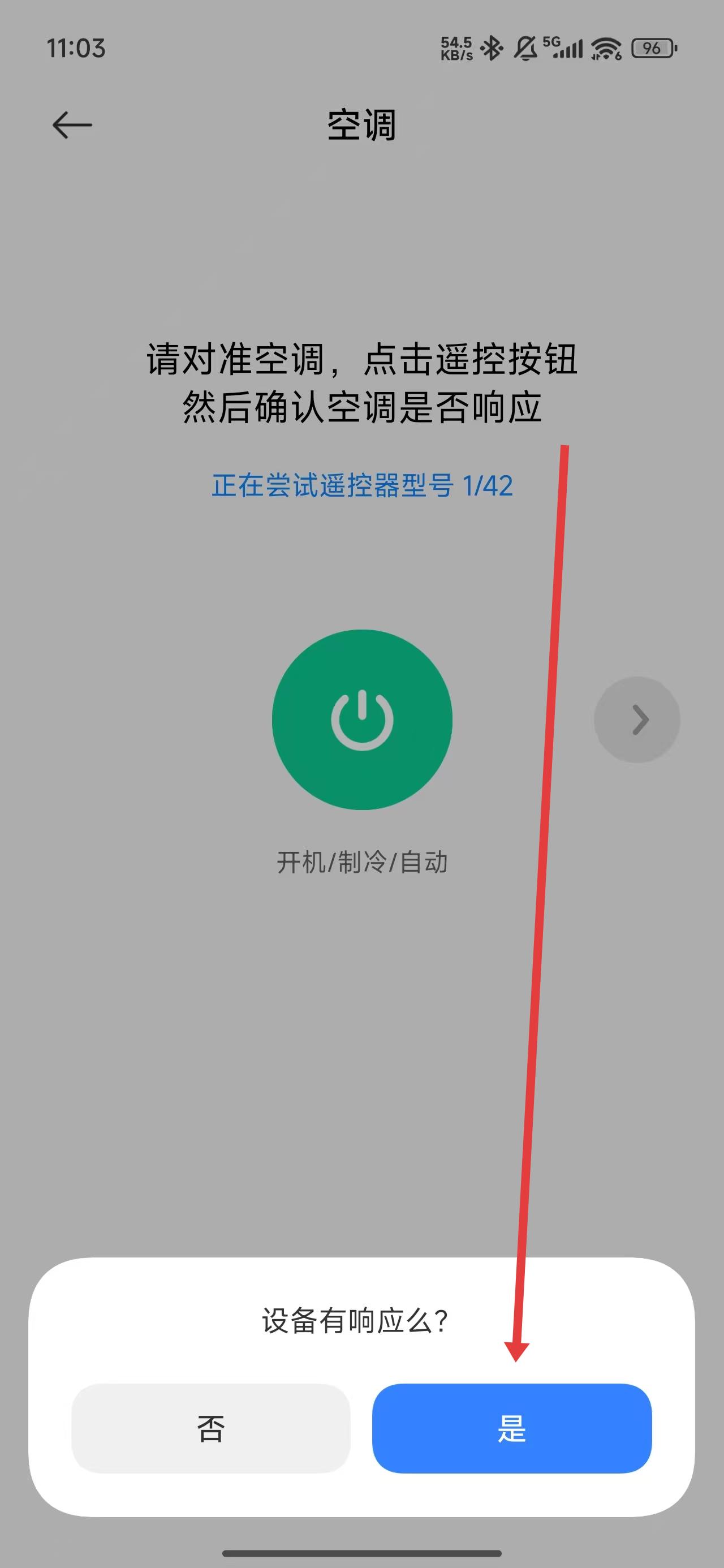 4、在進入設(shè)備調(diào)試頁面,點擊開關(guān)按鈕查看是否響應,點擊是按鈕后即可進行添加操作。
