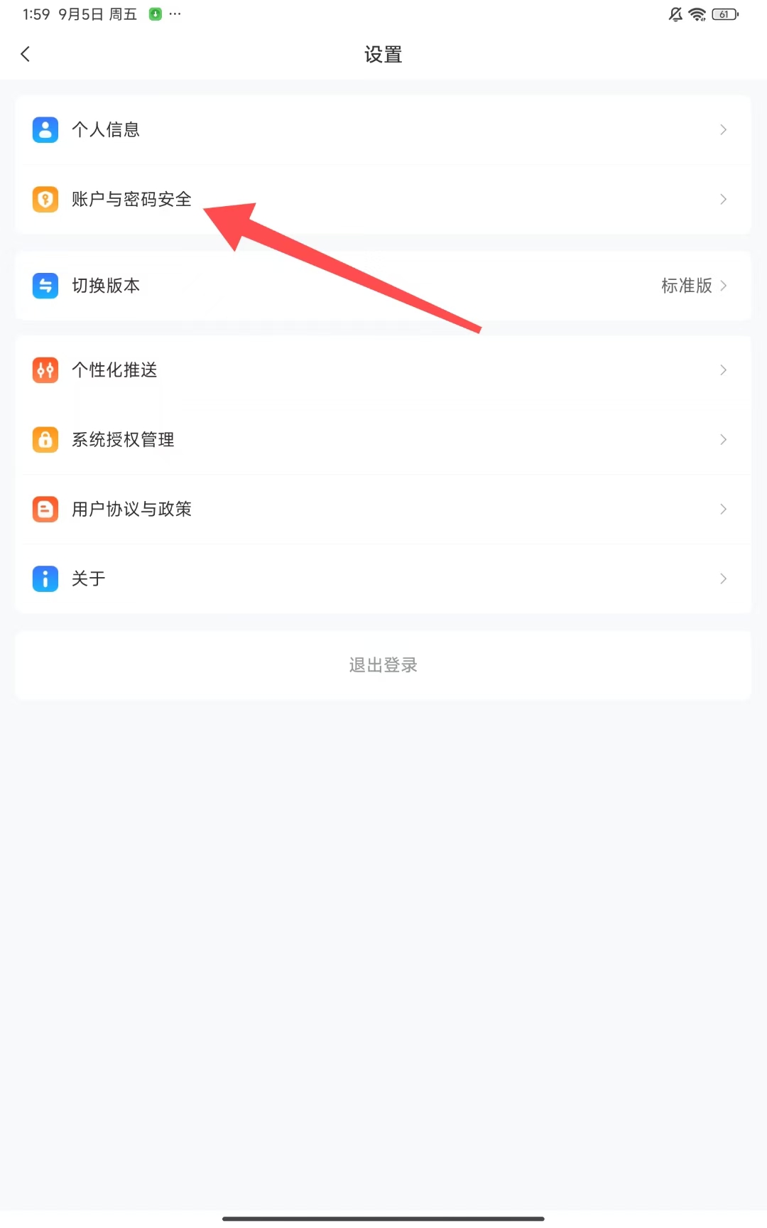 3、在設(shè)置頁面中找到賬戶與密碼安全選項并點擊進入。