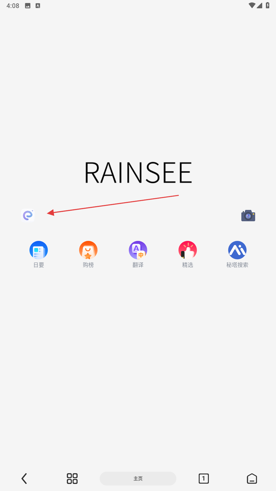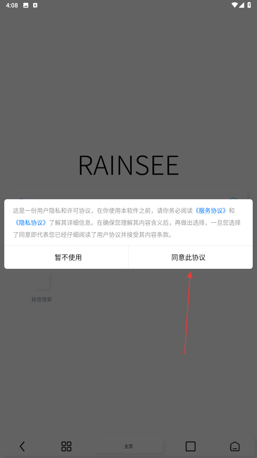 1、rains瀏覽器APP,進入時會跳出服務(wù)協(xié)議和隱私協(xié)議,點擊同意此協(xié)議的按鈕。