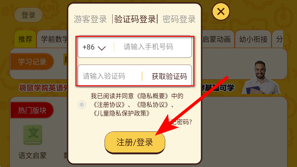 3、在頁(yè)面輸入手機(jī)號(hào)碼,獲取并輸入驗(yàn)證碼后,點(diǎn)擊注冊(cè)/登錄。