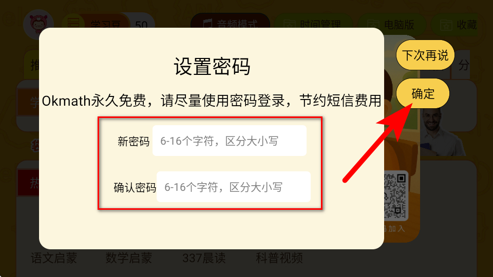 4、在密碼設(shè)置頁(yè)面,輸入新密碼并確認(rèn)密碼后,點(diǎn)擊確定完成注冊(cè)操作。