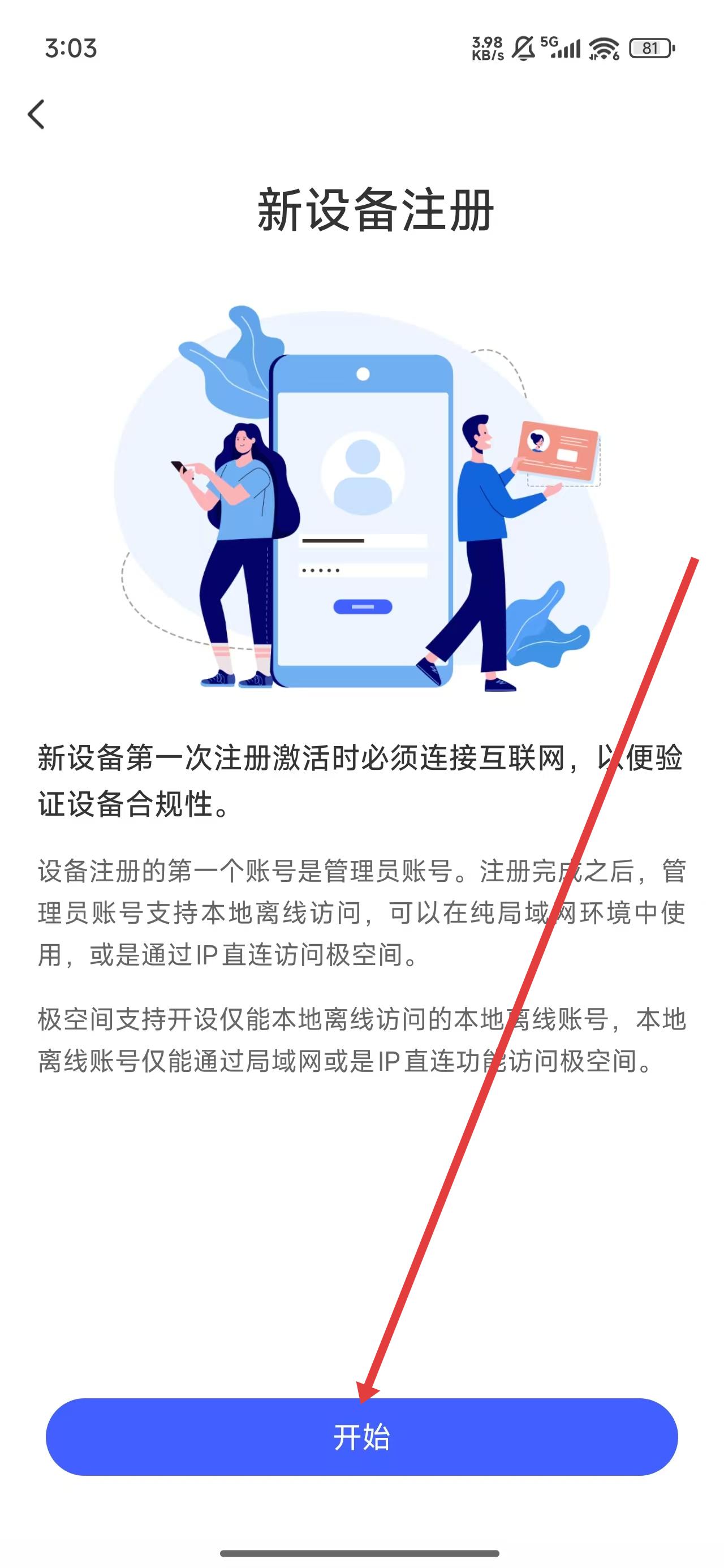 2、了解新設(shè)備注冊說明后,通過點(diǎn)擊下方開始按鈕,開始注冊操作。