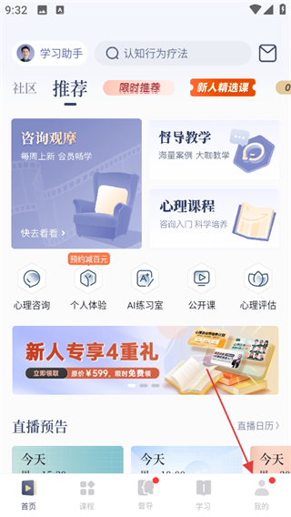 1、打開咨詢師之家APP,點(diǎn)擊底部導(dǎo)航欄中的我的選項(xiàng)。