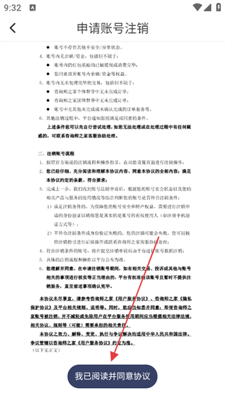 5、進(jìn)入申請(qǐng)賬號(hào)注銷頁面,點(diǎn)擊我已閱讀并同意協(xié)議按鈕。