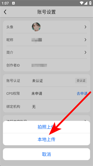 3、選擇拍照上傳或本地上傳,選取要設(shè)置的頭像圖片。