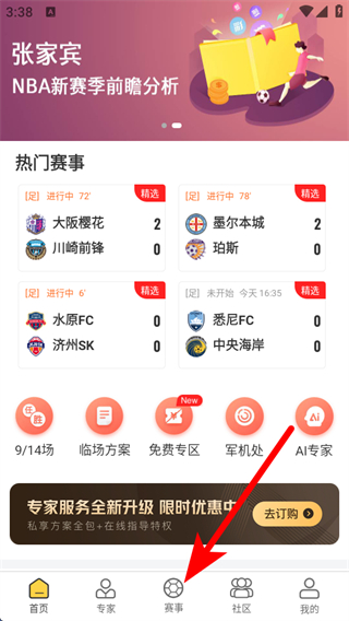 1、打開精準(zhǔn)比分APP,點(diǎn)擊底部賽事,進(jìn)入賽事板塊頁(yè)面。