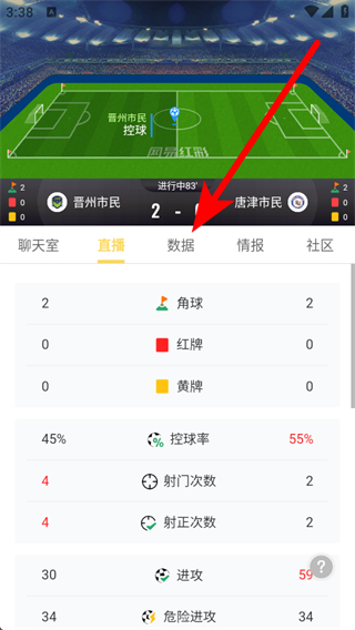 3、在比賽詳情界面,點(diǎn)擊數(shù)據(jù)標(biāo)簽,查看該場(chǎng)比賽的實(shí)時(shí)數(shù)據(jù)。