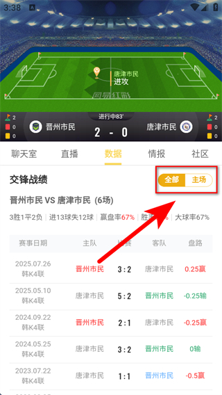 4、在數(shù)據(jù)頁(yè)面,還可點(diǎn)擊全部、主場(chǎng)等標(biāo)簽,查看更詳細(xì)的賽事信息。