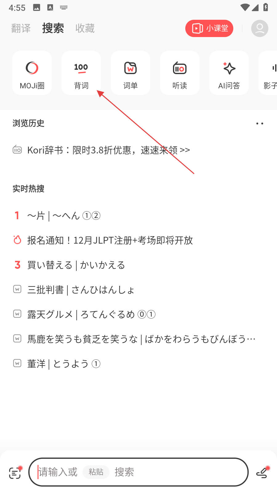1、打開moji辭書應用,點擊頁面上方背詞選項,進入官方推薦詞書列表頁面。