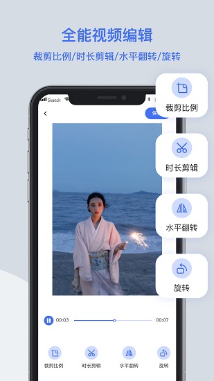 包括10多種編輯功能,視頻裁剪、時長剪輯、視頻翻轉(zhuǎn)、視頻旋轉(zhuǎn)等多種功能,多種方式完美支持視頻去水印、圖片照片去水印等功能。
