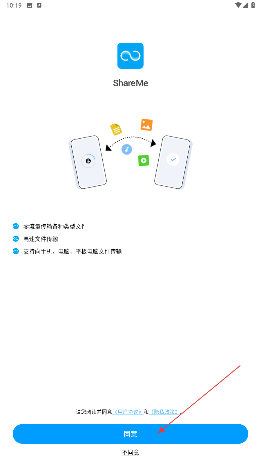 1、打開小米快傳APP,進(jìn)入時(shí)會彈出用戶協(xié)議和隱私政策,點(diǎn)擊同意的按鈕。