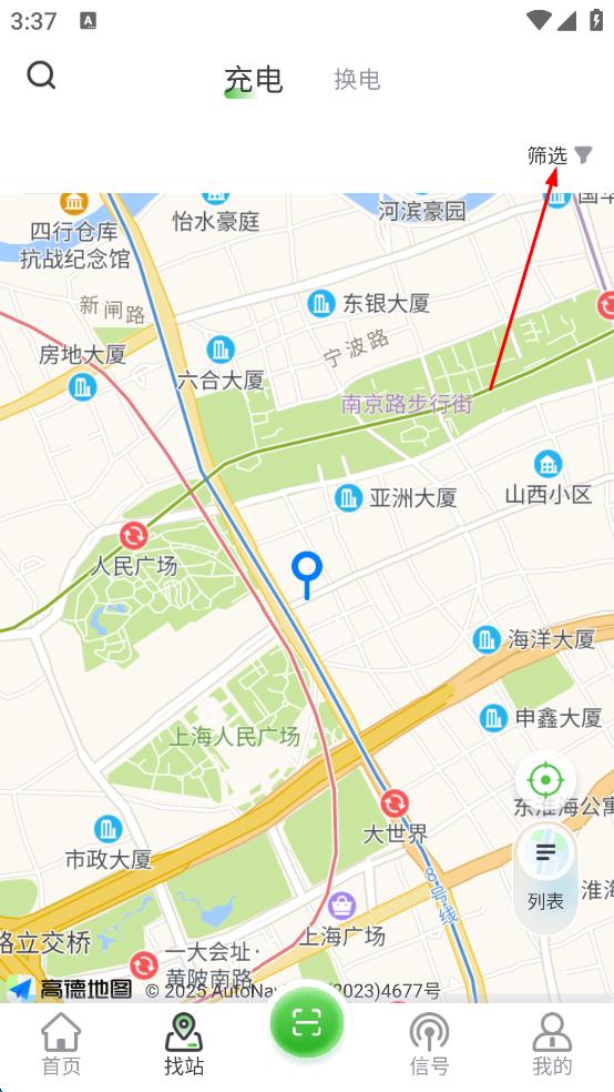 3、進(jìn)入充電地圖頁(yè)面,點(diǎn)擊右上角篩選按鈕,按需篩選站點(diǎn)條件,精準(zhǔn)查找符合需求的充電站點(diǎn) 。
