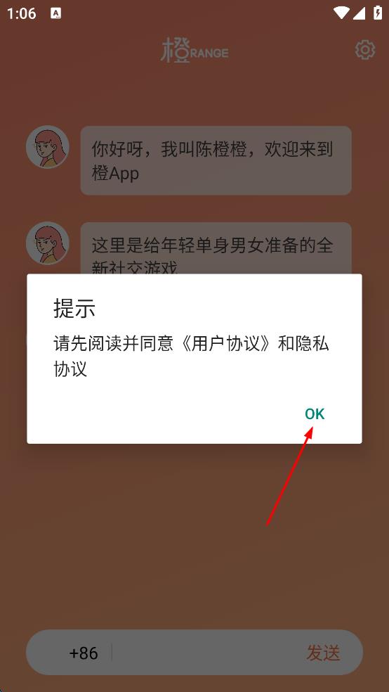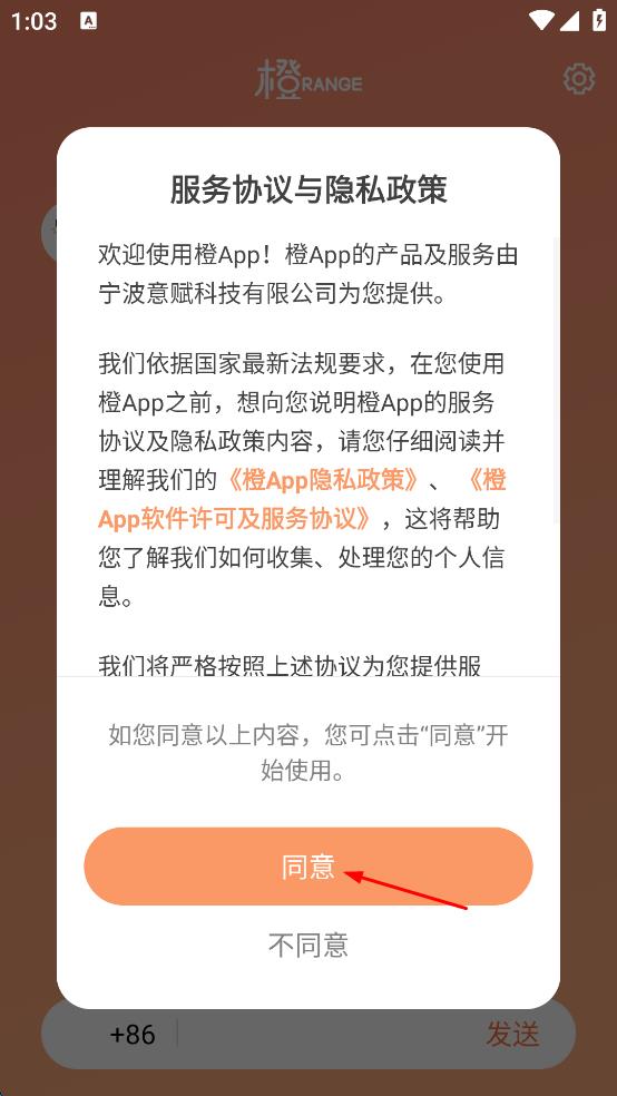 1、打開橙App,會(huì)彈出服務(wù)協(xié)議與隱私政策頁面,仔細(xì)閱讀后點(diǎn)擊同意按鈕。