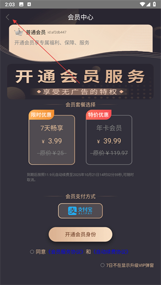 2、點擊之后會彈出會員開通的提示,點擊左上角的退出箭頭返回上個界面。