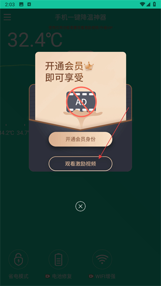 3、返回之后出現(xiàn)彈窗,點擊觀看激勵視頻,無需開通會員即可繼續(xù)使用降溫功能。