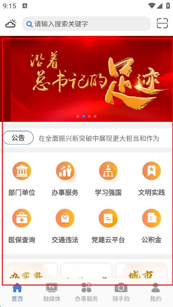 4、登錄成功后,自動跳轉(zhuǎn)至澄城通軟件首頁,即可查看首頁展示的沿著總書記的足跡主題內(nèi)容、公告以及部門單位、辦事服務(wù)等各類功能選項。
