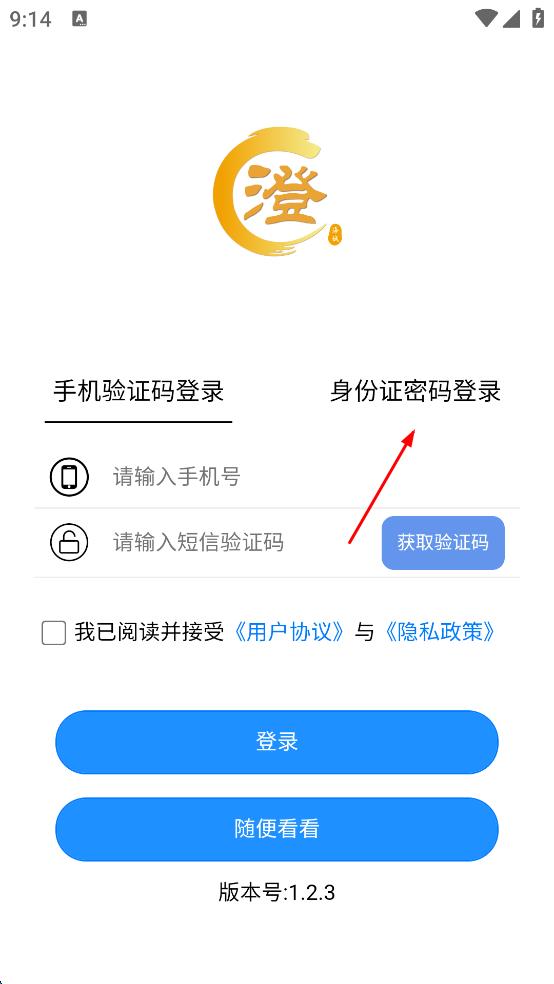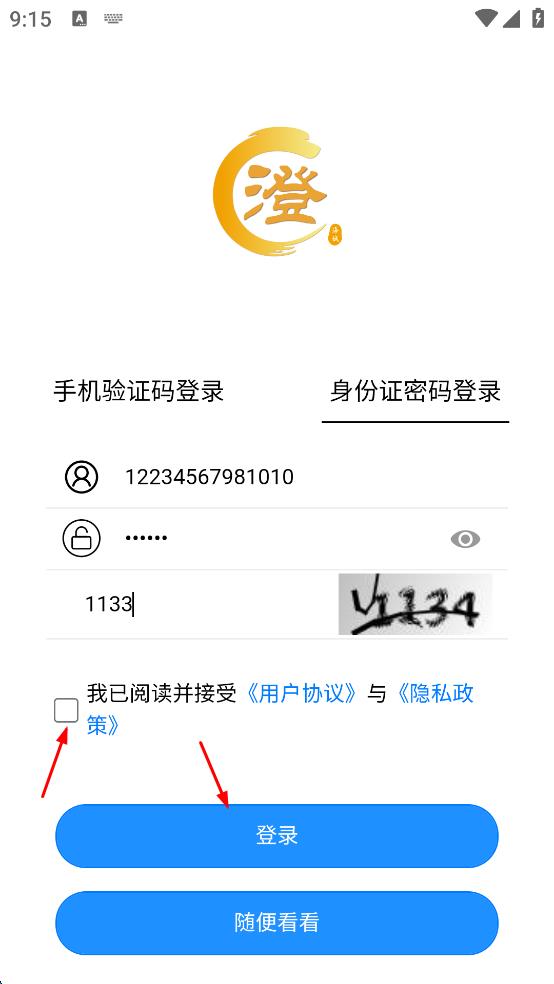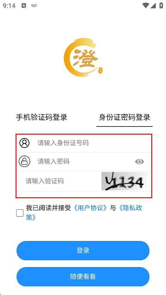 1、進入澄城通軟件登錄界面,點擊身份證密碼登錄選項,進入身份證密碼登錄頁面。