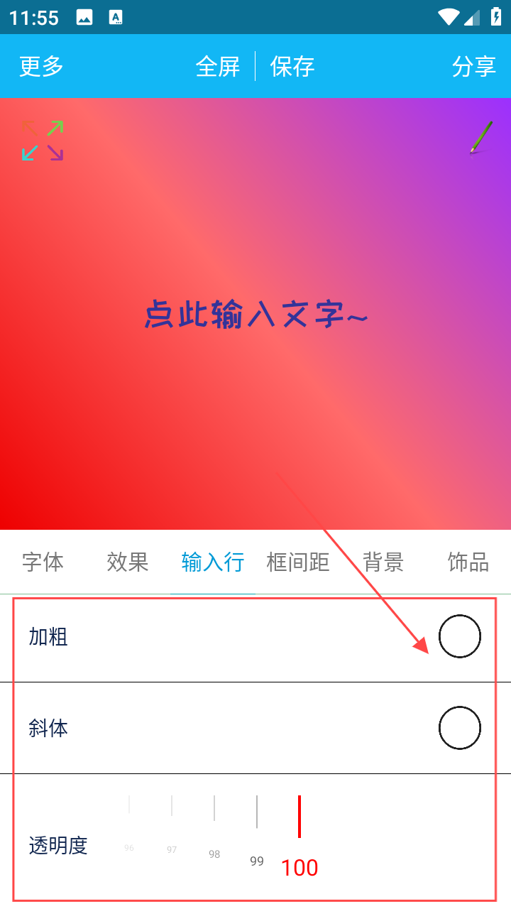 3、點(diǎn)擊字體可選擇不同字體樣式,點(diǎn)擊效果能更改字體顏色,還能設(shè)置加粗、斜體效果,拖動(dòng)透明度滑動(dòng)條可以調(diào)整文字的透明程度。