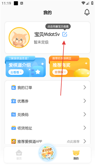 1、打開愛棋道圍棋app,點擊底部導(dǎo)航欄中的我的選項。