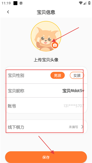 3、修改寶貝頭像、性別、昵稱、線下棋力等信息,點擊保存。