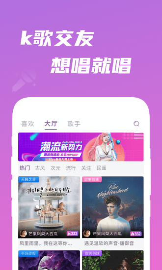歌見,以歌會(huì)友,真會(huì)玩。身邊人都夸你有衣服天籟之音的好嗓子,還不快來(lái)給大家展示一下,用你獨(dú)特的聲音去吸引同好,一起探討唱歌技巧,交流發(fā)聲心得,不斷提高歌唱水平,唱出更多有情感、有故事的精彩作品吧。歌見,等著你一起連麥哦。