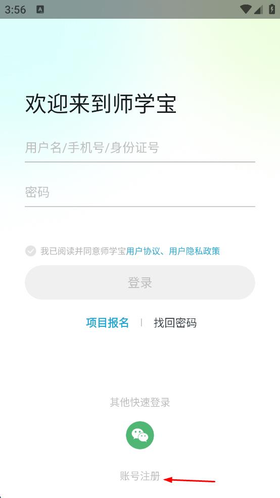 2、進(jìn)入歡迎來到師學(xué)寶的登錄界面,點(diǎn)擊“賬號注冊”,進(jìn)入賬號注冊頁面。