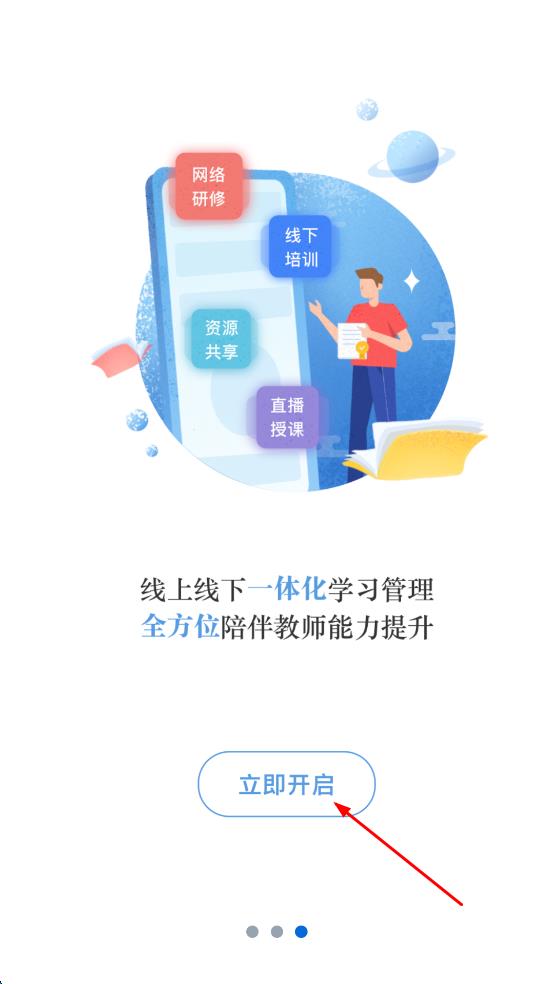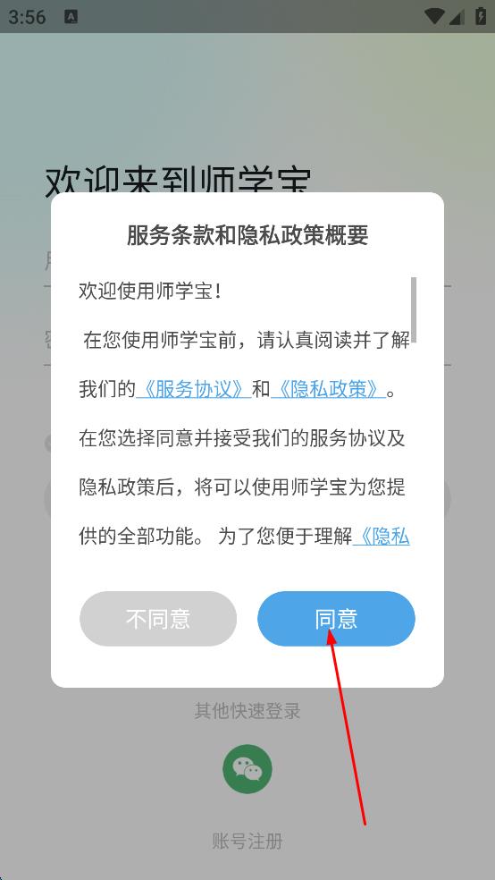 1、打開師學(xué)寶APP,在展示線上線下一體化學(xué)習(xí)管理的頁面,點(diǎn)擊“立即開啟”,進(jìn)入服務(wù)條款和隱私政策概要頁面后,點(diǎn)擊“同意”。