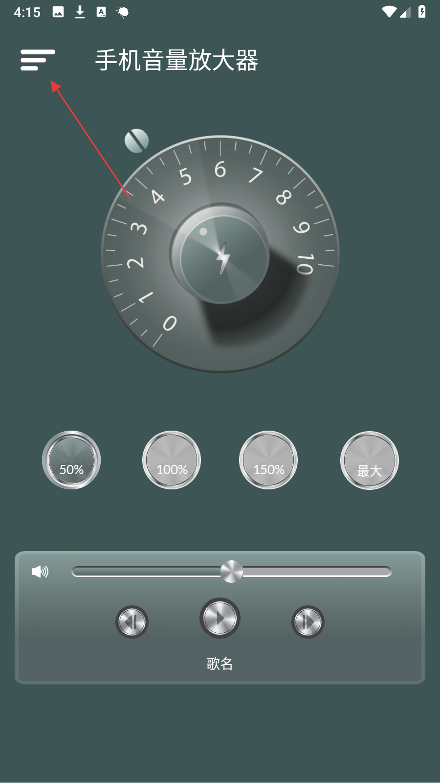 1、打開(kāi)手機(jī)音量放大器應(yīng)用,點(diǎn)擊界面左上角三條橫線(xiàn)的菜單按鈕,進(jìn)入設(shè)置頁(yè)面。