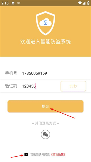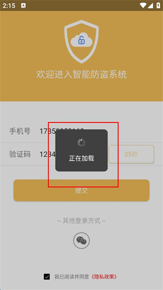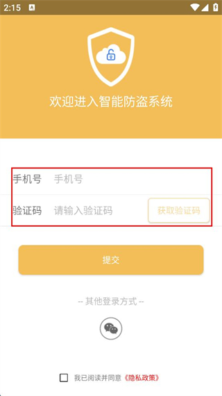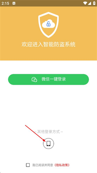 1、打開智能防盜系統(tǒng),點擊其他登錄方式下的手機圖標(biāo)。