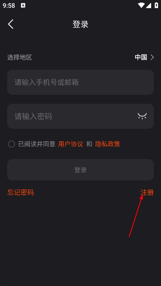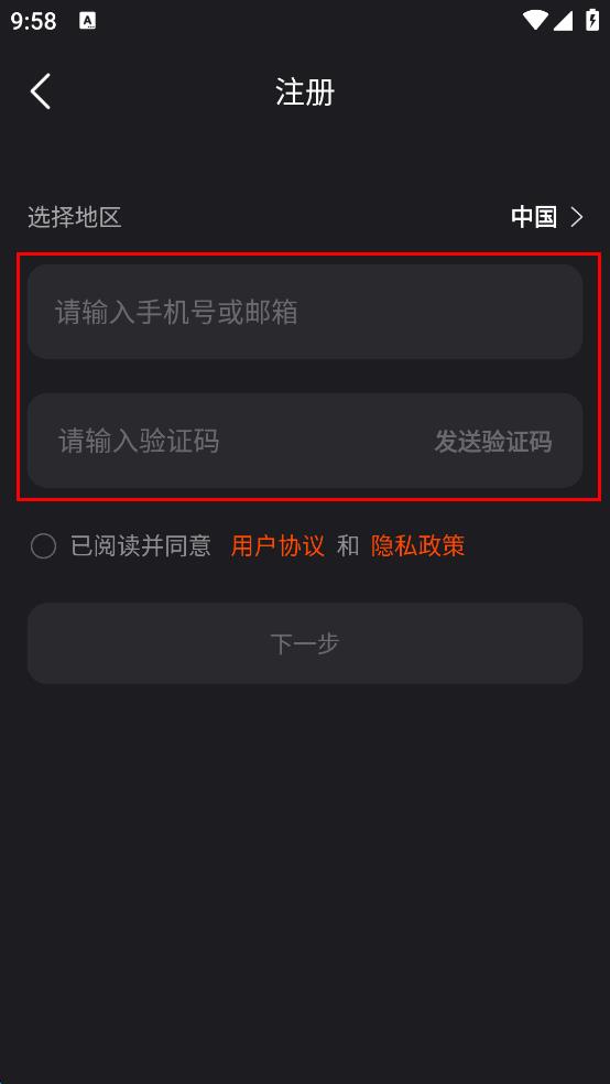 3、在注冊頁面輸入手機(jī)號或郵箱,點擊發(fā)送驗證碼并輸入。