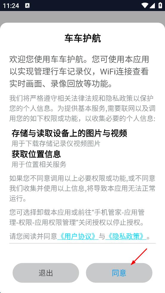 1、打開(kāi)車車護(hù)航APP,出現(xiàn)權(quán)限說(shuō)明頁(yè)面,仔細(xì)查看后點(diǎn)擊“同意”按鈕。