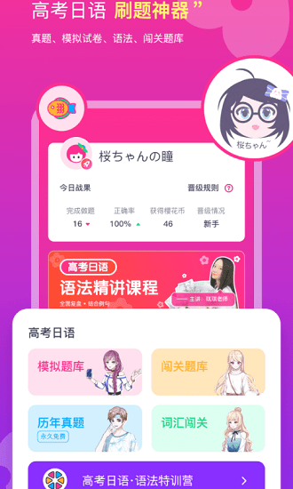櫻花斬APP是一款趣味和實(shí)用相結(jié)合的日語考試智能題庫軟件,為高考日語、日語能力考級(JLPT)提供海量做題練習(xí)和復(fù)習(xí)備考服務(wù),讓考試更有把握,是日語考試高分神器。日語水平從入門到精通,櫻花斬APP全程陪伴你學(xué)習(xí),詞匯、語法、考試、名師等服務(wù)一網(wǎng)打盡,快速提升你的日語。