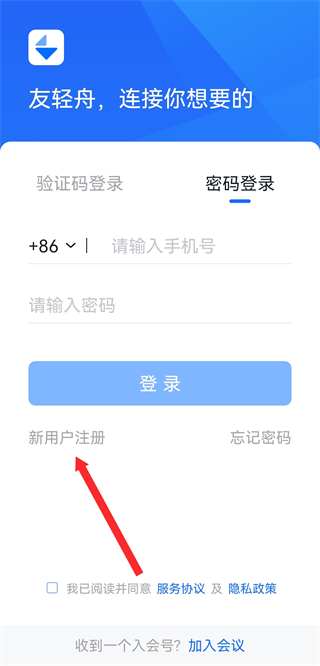 1、打開智悅輕舟APP,在登錄界面點(diǎn)擊新用戶注冊。
