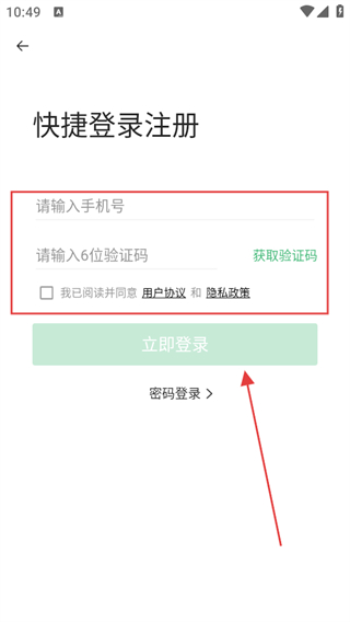 4、輸入手機號,輸入驗證碼,勾選用戶協(xié)議和隱私政策,點擊立即登錄。