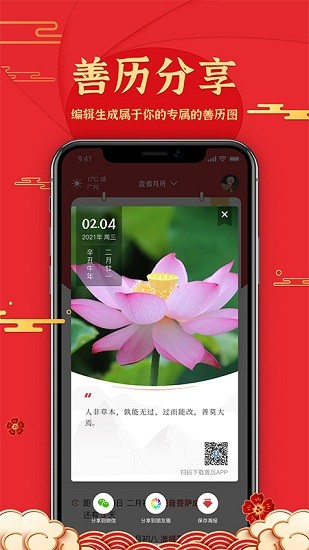 善歷,記錄每一個(gè)心懷善念的日子。app上根據(jù)科學(xué)的天文算法制作了多種多樣的日歷,用戶可以根據(jù)自己的需要選擇、查看、設(shè)置,非常方便。還有各種佛法知識(shí)科普,供用戶了解,讓人內(nèi)心得到安寧,培育人的善心。還有一鍵分享功能,生成獨(dú)特海報(bào),傳遞給親朋好友。有需要的用戶趕緊下載使用吧。