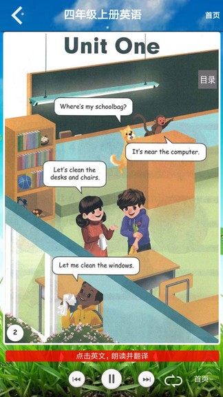 pep四年級英語上冊君政教育人教版可以讓學(xué)生們同步學(xué)習(xí)英語教材上的知識點(diǎn)。這個(gè)app完全同步了小學(xué)四年級英語課程內(nèi)容,可以點(diǎn)讀單詞、詞匯、課文內(nèi)容。還附帶了詳細(xì)的課后習(xí)題解析內(nèi)容。是小學(xué)生必備的英語點(diǎn)讀app。