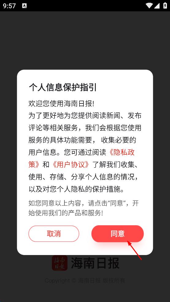 1、打開海南日報APP,在彈出的個人信息保護指引頁面,點擊“同意”按鈕,進入APP主界面。