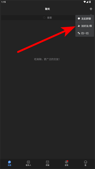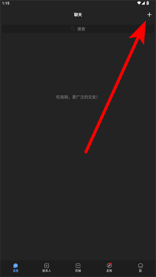 1、打開旺商聊APP,進入消息頁面,點擊右上角加號圖標。