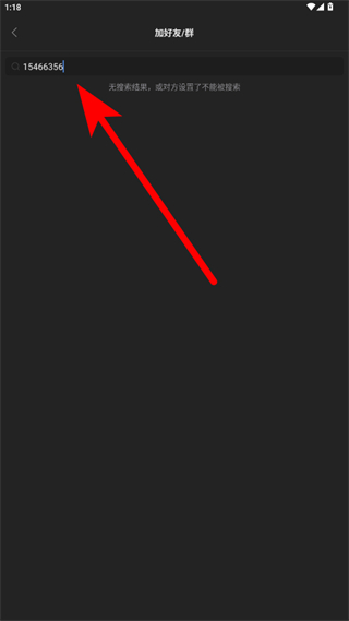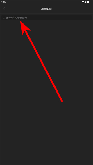 3、進入加好友/群頁面,在賬號/手機號/群編號輸入框中,輸入對方賬號、手機號或者群編號。