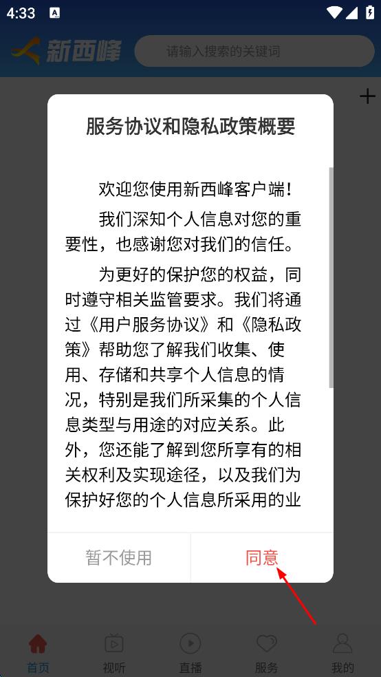 1、打開新西峰,彈出服務(wù)協(xié)議和隱私政策概要,點(diǎn)擊同意,進(jìn)入軟件首頁(yè)。