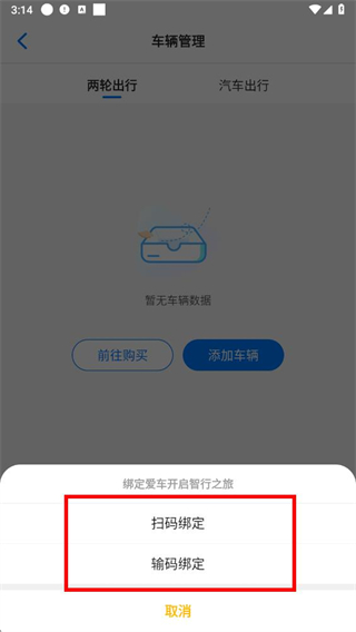 4、在彈出的綁定方式選擇框中,選擇掃碼綁定或輸碼綁定,按照提示完成車輛添加操作。