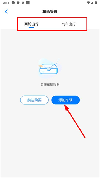 3、在車輛管理界面,選擇出行類型,比如兩輪出行或汽車出行,然后點(diǎn)擊添加車輛按鈕。