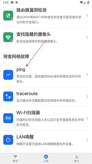2、在工具頁(yè)面,點(diǎn)擊ping選項(xiàng)。