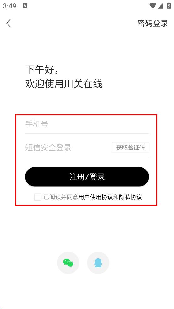 4、在登錄界面輸入手機(jī)號(hào),點(diǎn)擊獲取驗(yàn)證碼并輸入,勾選已閱讀并同意用戶使用協(xié)議和隱私協(xié)議,點(diǎn)擊注冊(cè)/登錄。