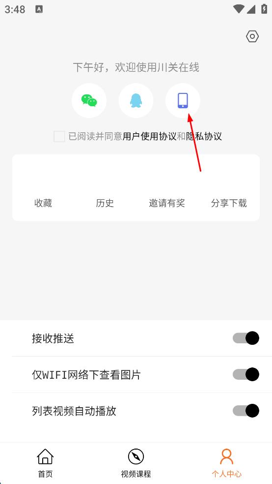 3、在個(gè)人中心頁面,點(diǎn)擊手機(jī)圖標(biāo)進(jìn)入登錄界面。