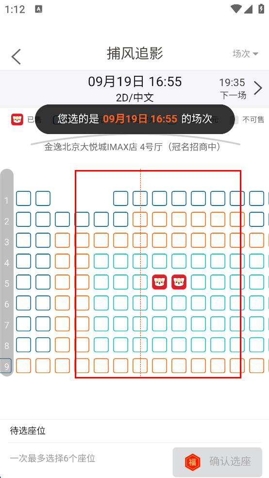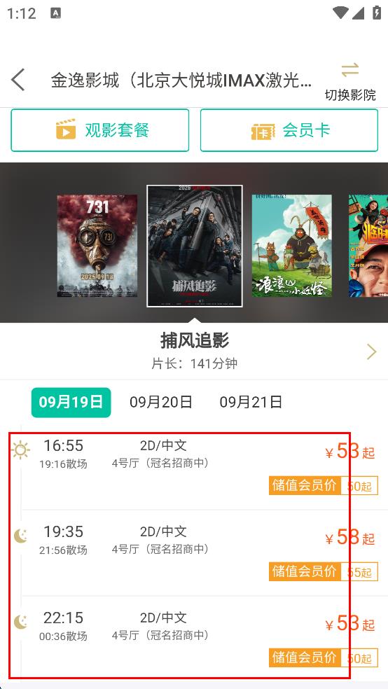 3、進入所選影院的電影場次頁面,選擇觀看“捕風追影”的日期,如09月19日,然后在該日期下的場次中,選擇合適的場次,比如16:55的場次,點擊該場次。