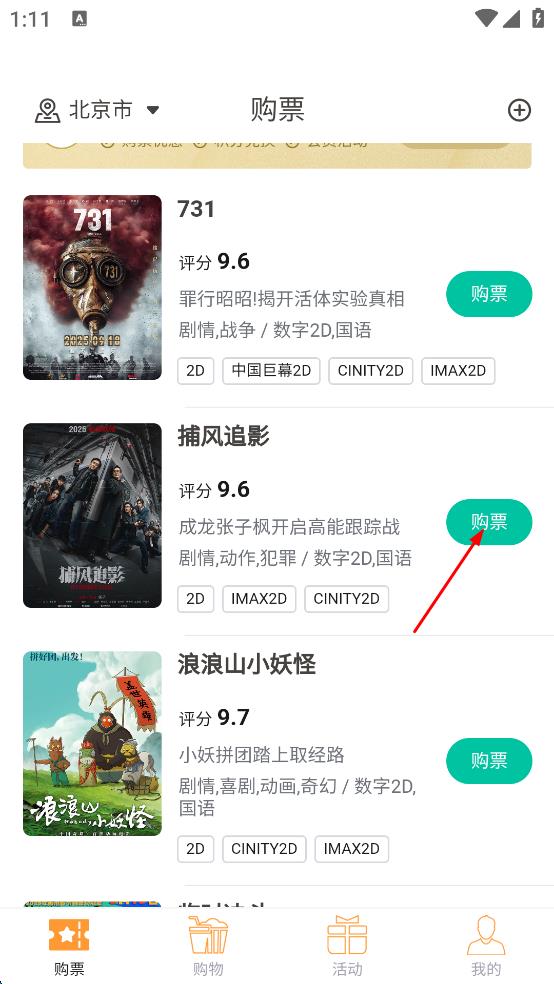 1、打開購票軟件,進入購票頁面,瀏覽展示的電影列表,找到想要觀看的電影,比如“捕風追影”,點擊其對應(yīng)的“購票”按鈕。